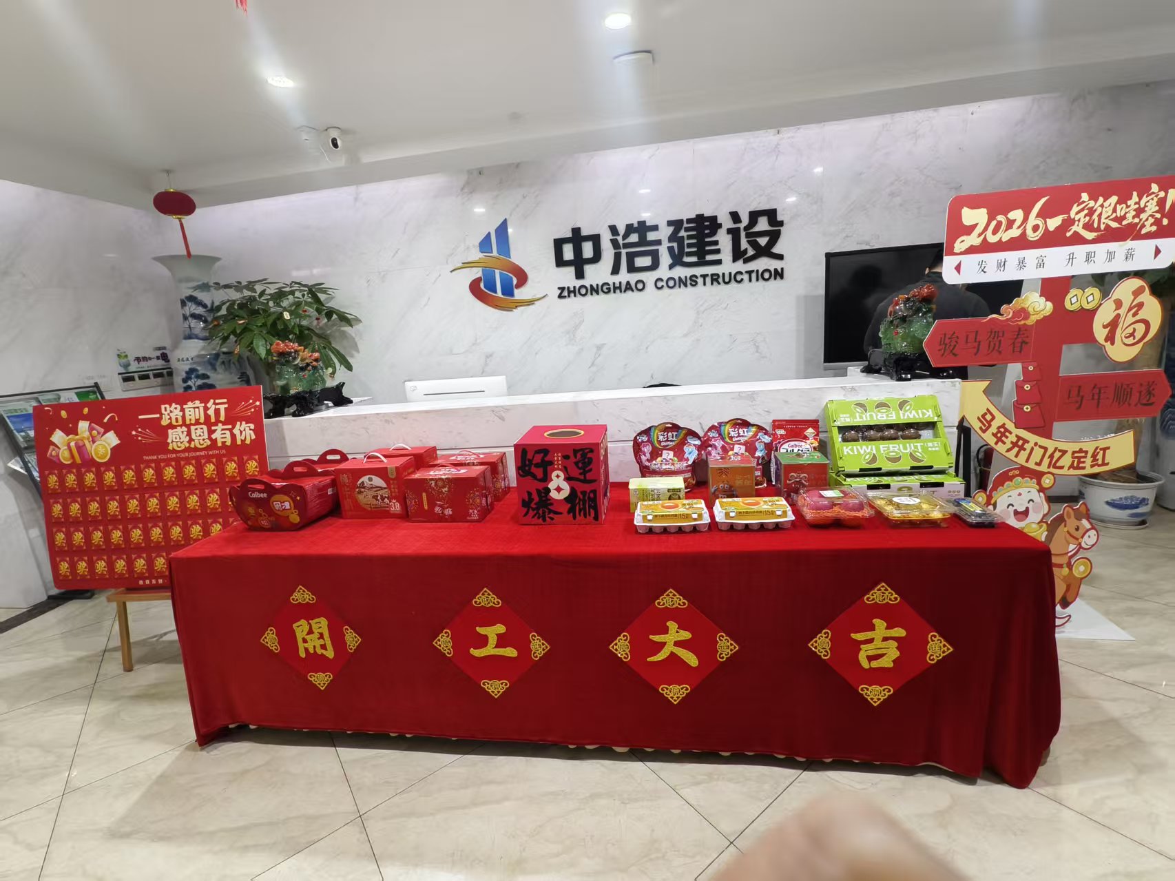 步入前台,铺展的红色桌布上,“开工大吉”四字熠熠生辉,各类新春礼盒、零食大礼包满满当当,一旁的红包抽奖墙格外醒目,“一路前行 感恩有你”的标语温暖又有力,每一处细节都彰显着公司对全体同仁的美好祝福。